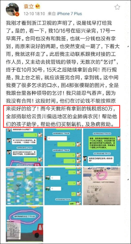 據瞭解,10月12日,袁立曾在微博上交代《演員的誕生》的錄製費用去處:税後80萬,全部捐獻給雲貴川偏遠地區的塵肺病農民。
