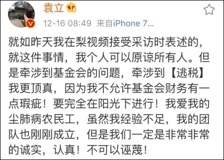 袁立12月16日發佈微博稱,雖然她個人可以原諒所有人,但牽涉到基金會的問題,牽涉到“逃税”的問題,一定要“頂真”。