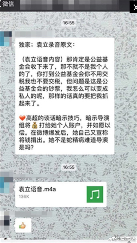 但在12月14日,有媒體爆料了袁立的一段杭州話錄音,稱袁立暗示《演員的誕生》節目組將80萬元酬勞打進她個人賬户而非公益基金,錄音還牽涉到“逃税”問題。