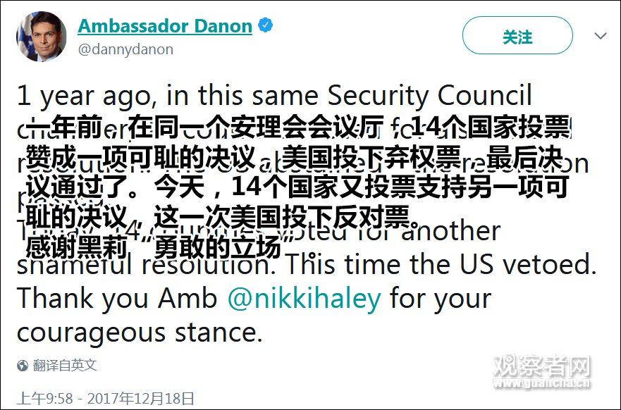 【觀察者網綜合報道】昨天(18日),因美國動用一票否決權,聯合國安理會未能通過有關耶路撒冷地位問題的決議草案。