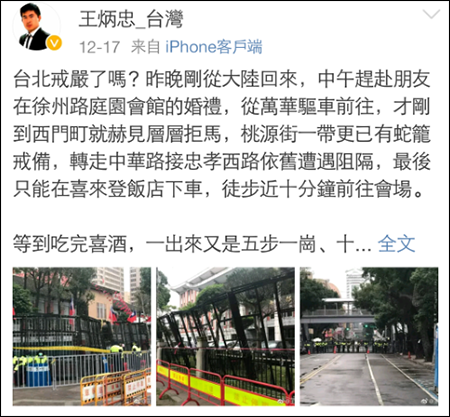 本月16日,王炳忠剛剛隨新黨訪問團從大陸返台。17日他發微博感慨,大老遠在西門町就見到層層拒馬,戒備森嚴,最後自己只能下車徒步十分鐘前往會場。