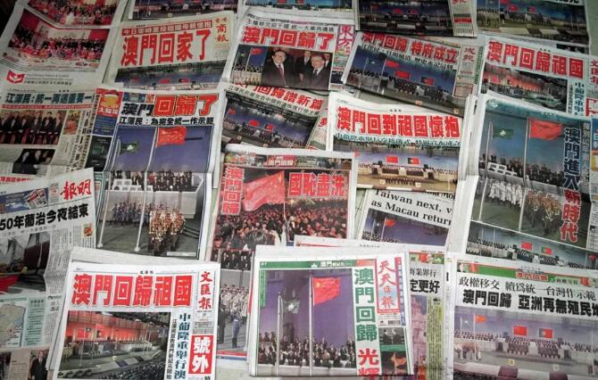 1999年12月20日澳門迴歸祖國,香港所有報紙對這一歷史時刻作充分報道。新華社記者 張燕輝 攝