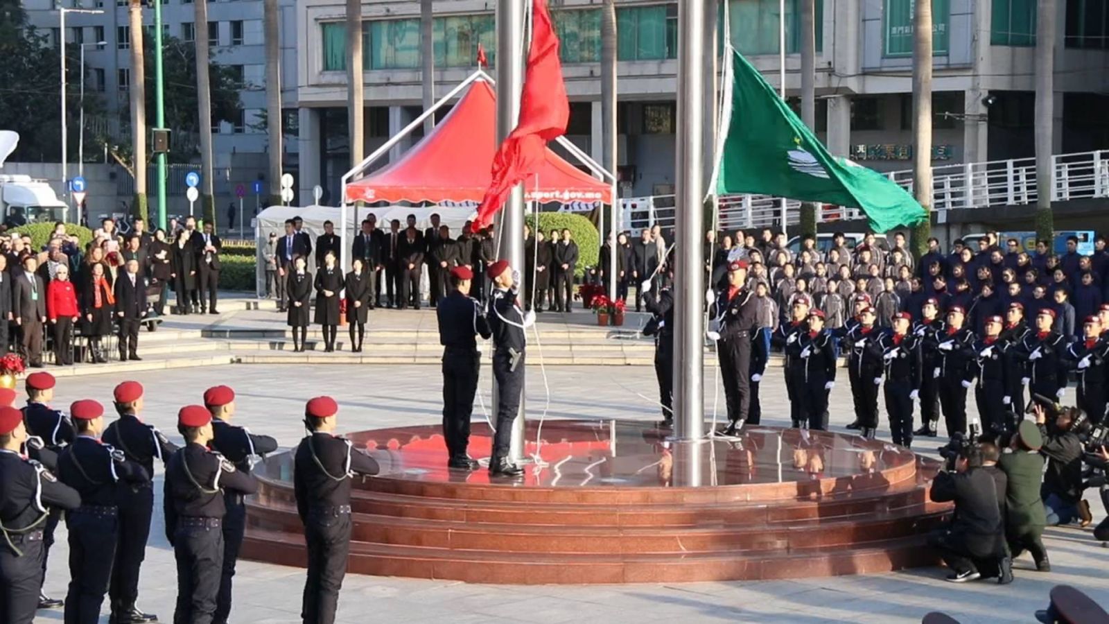 八時整,特警儀仗隊護送國旗、區旗進場。澳門警察銀樂隊奏響中華人民共和國國歌,鮮豔的五星紅旗與澳門特別行政區區旗冉冉升起。出席儀式的澳門各界人士、觀禮的市民和遊客莊嚴肅立,行注目禮。在冬日暖陽的照射下,金蓮花雕像熠熠生輝,五星紅旗與澳門特區區旗隨風飄揚。