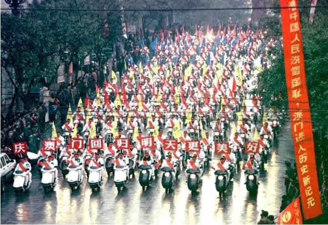 1999年12月20日,重慶市舉行千乘“迴歸彩車”巡遊活動,喜慶澳門迴歸祖國。圖為由千輛重慶市自產的汽車、摩托車組成的方陣在市區街道巡遊。新華社記者 楊磊 攝