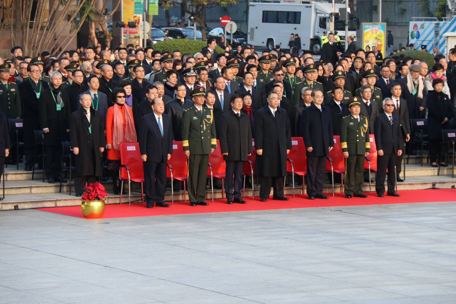澳門特別行政區長官崔世安、中央人民政府駐澳門特別行政區聯絡辦公室主任鄭曉松、外交部駐澳特派員公署署理特派員葉大波、解放軍駐澳司令員王文、政委周吳剛、立法會主席賀一誠等澳門政府主要官員、社會各界人士數百人出席升旗儀式。