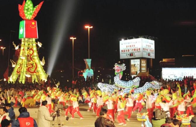 1999年12月20日凌晨,天津市民慶澳門迴歸活動達到高潮,人們載歌載舞,共賀這一歷史時刻的到來。新華社記者 馬平 攝