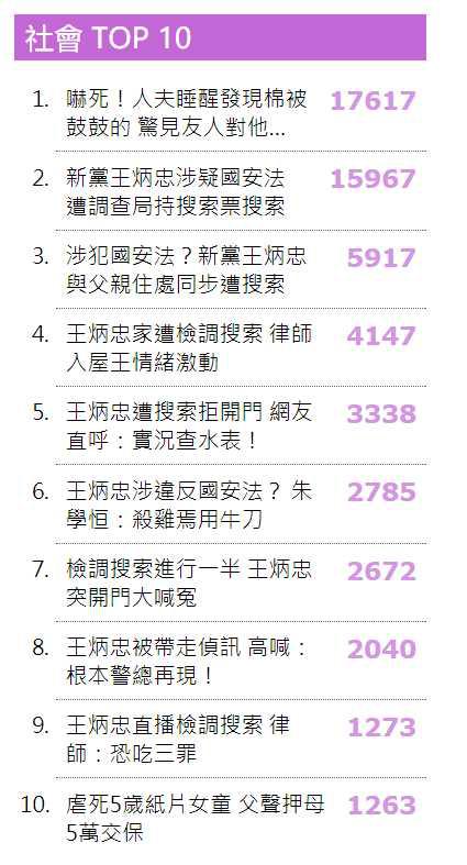 台灣新聞網站的社會前十大熱點中,有八條是新黨青年被帶走