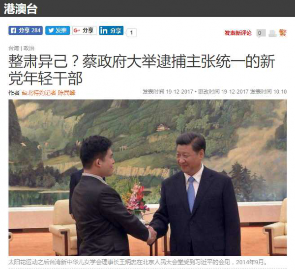 媒體更是以“整肅異己?蔡政府大舉逮捕主張統一的新黨年輕幹部”的標題來報道此事