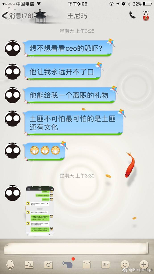 不僅如此,這位“王尼瑪”還表示,自己目前正遭到CEO的口頭恐嚇和非法監視——“屋內監控”。