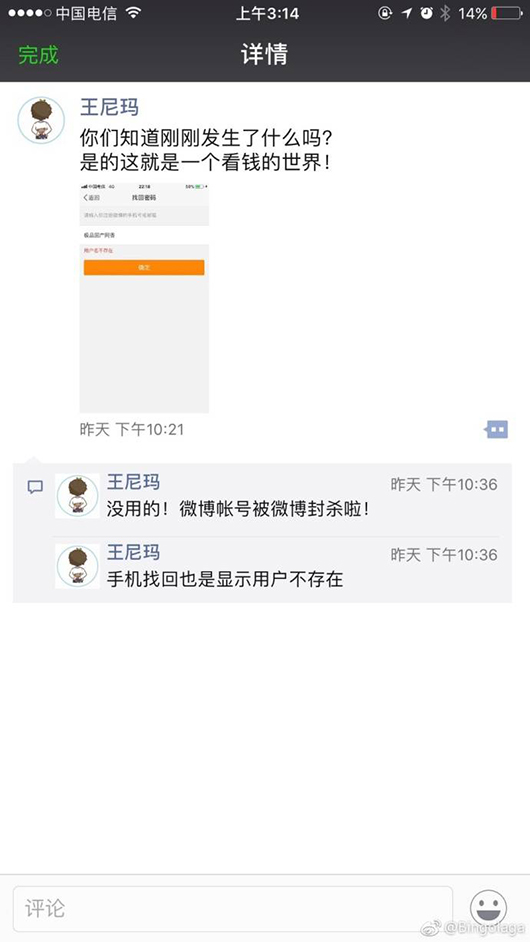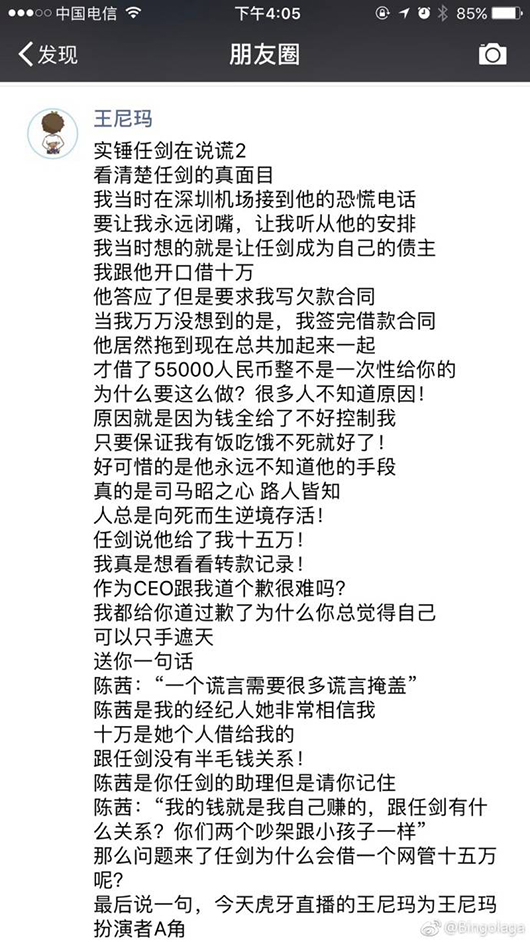 而對任劍言論和王尼瑪官方微博的澄清,所謂“王尼瑪”又在朋友圈稱,任劍在説謊,他説他給了我十五萬!我真是想看看轉款記錄!