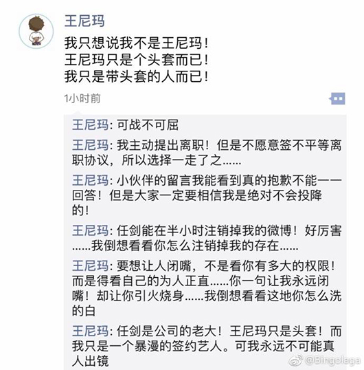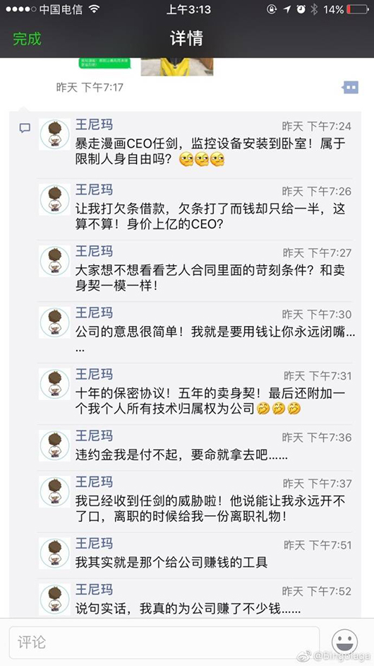 這位“王尼瑪”還曝出自己受到的諸多不公正待遇:任劍將監控設備安裝到卧室;打欠款借條,欠條打了錢只給一半;藝人合同裏有苛刻條件,十年保密協議、五年賣身契,另外附加個人所有技術歸屬權為公司。