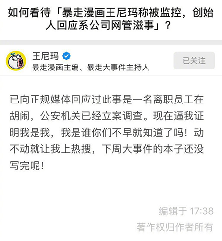 昨天下午,王尼瑪認證賬號也在知乎作出回應:已向正規媒體回應過此事,是一名離職員工在胡鬧,公安機關已經立案調查。