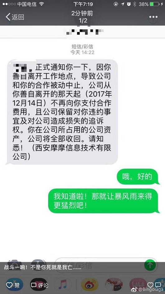 根據微博中的一張短信截圖,合同終止通知短信的署名為“西安摩摩信息技術有限公司”,正是暴走漫畫所屬公司。