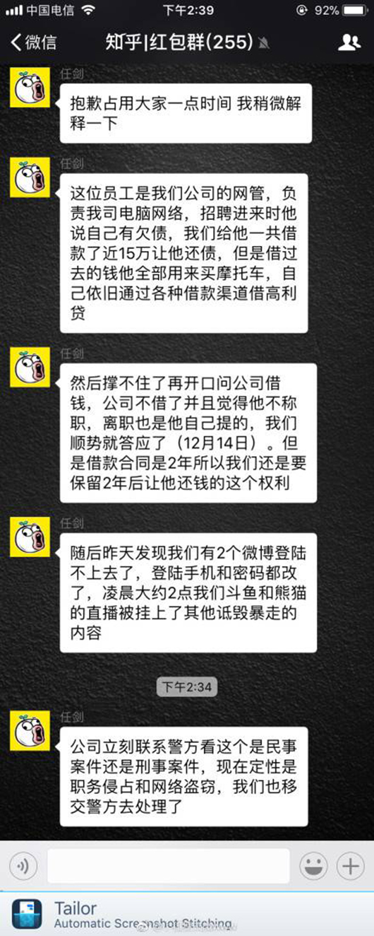 21日下午,任劍還向虎嗅表示:“離職公司的網管拿着我們的賬號黑我,你覺得我要不要和他一般見識?”