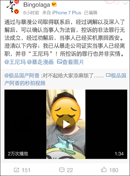 而到今日凌晨,所謂的“王尼瑪”突然發佈道歉視頻。