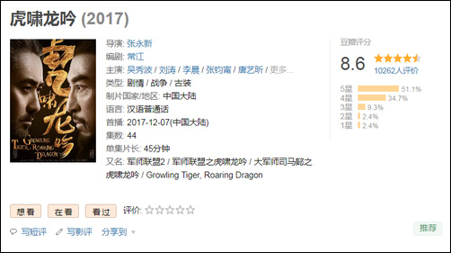 【文/觀察者網 肖晟仕】《大軍師司馬懿之虎嘯龍吟》相信不少朋友都在追,豆瓣評分上甚至超過了《軍師聯盟》,達到了8.6分的好成績,可以説是口碑人氣雙豐收。