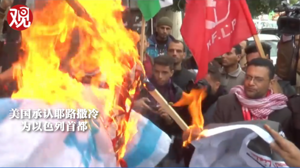 巴勒斯坦民眾燒燬美以兩國國旗抗議