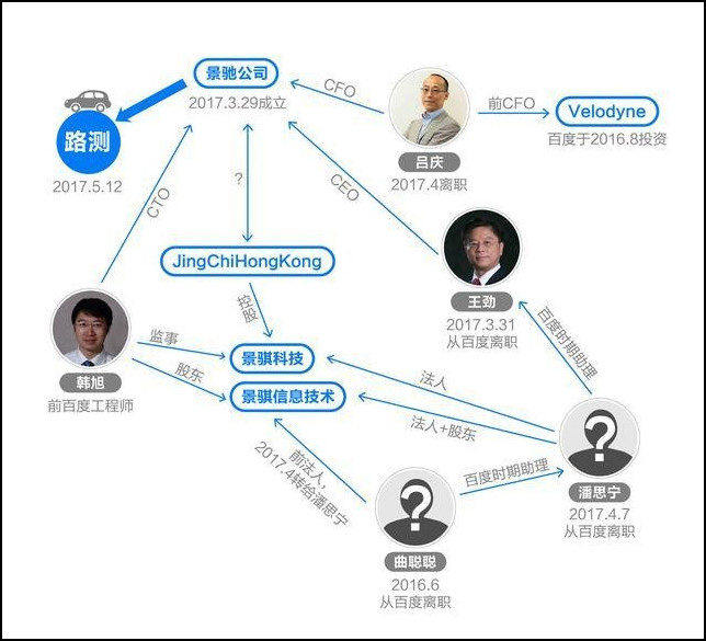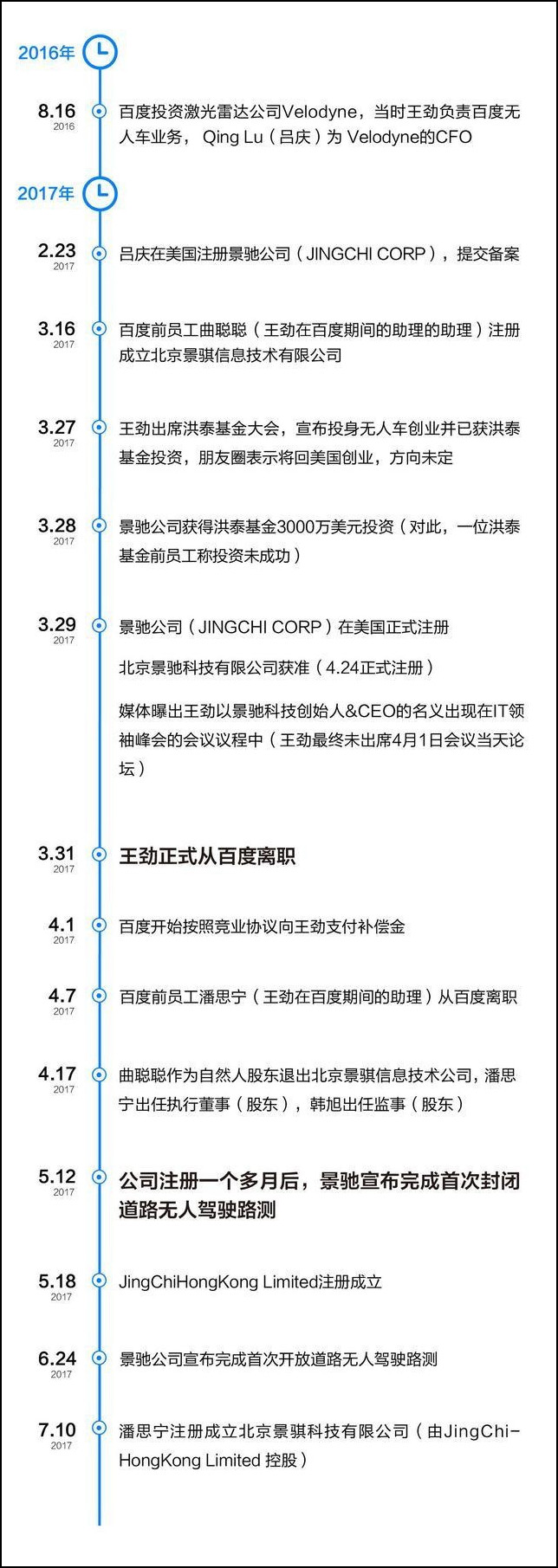 2016年8月,百度投資激光雷達廠商Velodyne LiDAR,現任景馳CFO呂慶是Velodyne LiDAR當時的CFO。2017年2月23日,呂慶在美國註冊景馳公司(JINGCHI CORP),提交備案。2017年3月16日,百度前員工曲聰聰(王勁在百度期間的助理的助理)註冊成立北京景騏信息技術有限公司。