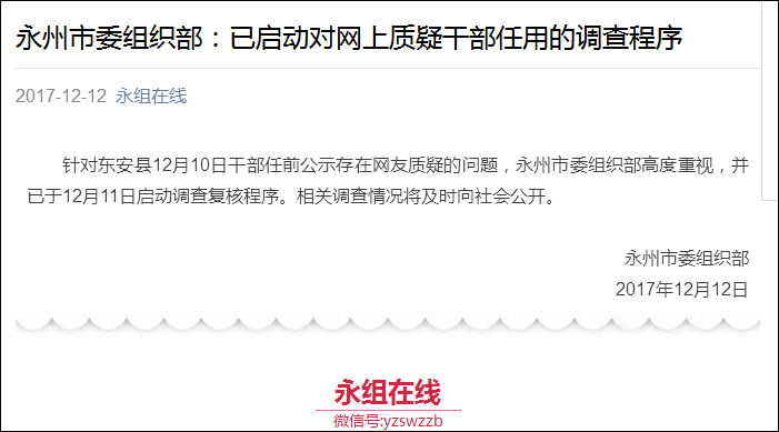 12月12日晚,永州市委組織部通過其微信公號“永組在線”通報,針對東安縣12月10日干部任前公示存在網友質疑的問題,永州市委組織部高度重視,並已於12月11日啓動調查複核程序。相關調查情況將及時向社會公佈。