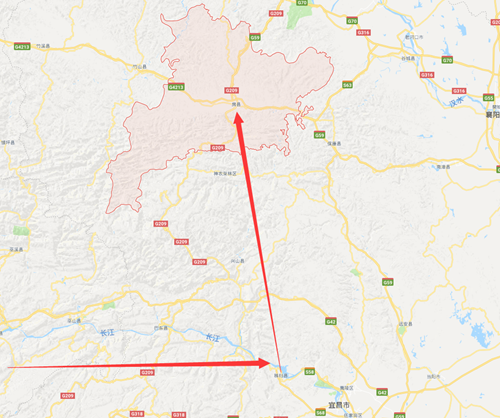 韓冉大致的行走路線(現代版):從成都出發東到秭歸,再到北上房縣