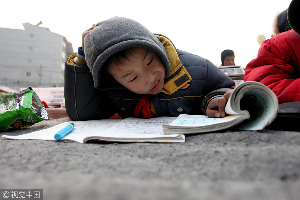 一名在菜攤上寫作業的孩子 來源:視覺中國