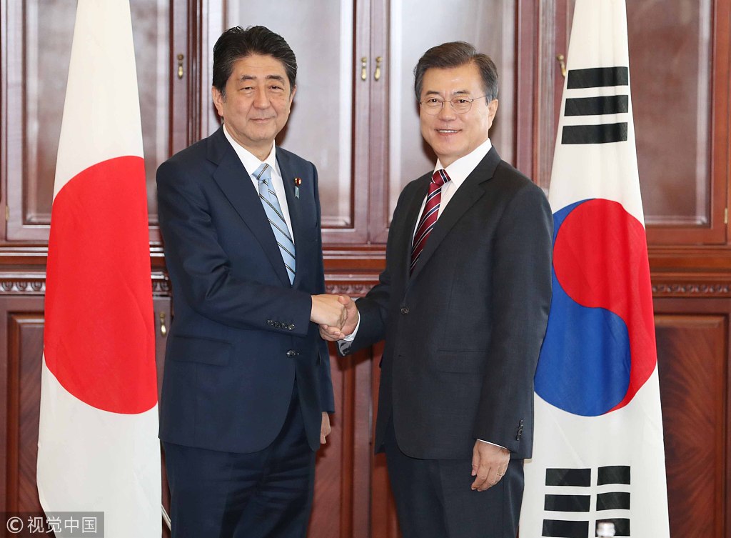 2017年9月7日,正在俄羅斯進行訪問的韓國總統文在寅與日本首相安倍晉三舉行首腦會談 @視覺中國