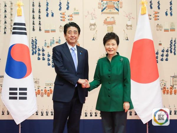 2015年11月2日,在韓國首爾的青瓦台總統府,韓國總統朴槿惠(右)會見日本首相安倍晉三