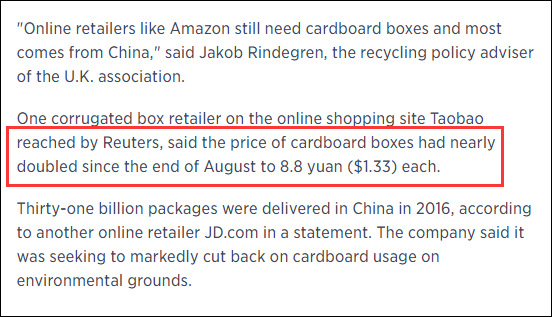 CNBC的報道認為洋垃圾禁令會讓中國的快遞包裝盒成本翻倍