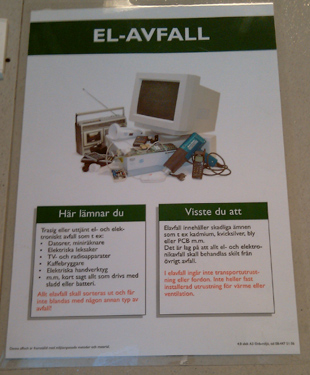 生活類垃圾的分類也是基於瑞典製造業和商務部門指定的包裝材料主要,是六大類:玻璃(Glas),塑料(Plast),紙張(Papper),金屬(Metall),陶瓷(Keramik)和木質類(Trä),只不過轉換成垃圾的時候木質和紙張歸到一類,再把食物殘渣單獨歸類,塑料再細分為有害無害。