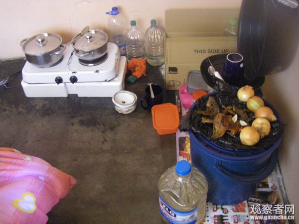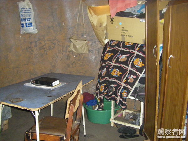 看看他的幾個圓錐型茅草土房,的確像是成本為零。這些房子裏面的傢俱也像是成本為零,一個圓錐型房子裏有一個泥土砌成的“沙發”,上面鋪了幾張獸皮,另一個圓錐型房子裏有極其破舊的一張桌子和一把椅子,還有一個櫥門已經破損得無法關上的衣櫃,這些東西破得像是城裏人扔掉的垃圾。