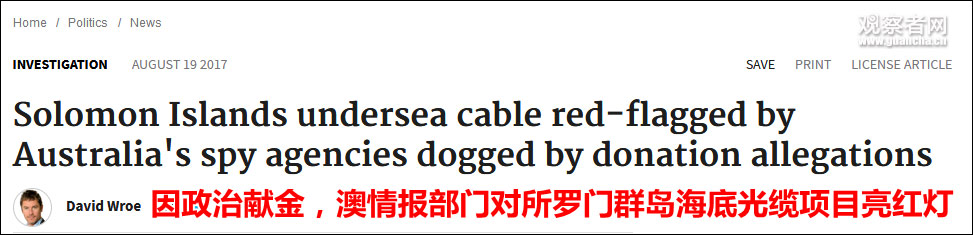 但在去年,所羅門羣島政府在沒有經過適當程序的情況下,突然轉向了華為的一家子公司(即華為海洋,觀察者網注),該公司因安全問題,被澳大利亞情報部門禁止競標某些合同。該報道還稱,所羅門羣島前任政府接受華為650萬美元政治獻金的事件當時“浮出水面”。