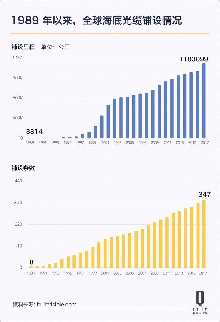 1990年代之後全球互聯的萬維網對帶寬提出更高的要求,海底光纜的鋪設數量和里程數也從這個時候開始快速增加。