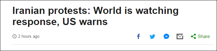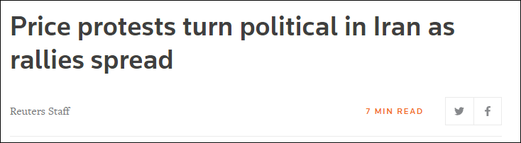 報道稱,目前已至少有7個城市發生了不同規模的抗議示威活動,少則數十人,多則成千上萬人。這是伊朗自2009年以來,最大的一場示威抗議活動。
