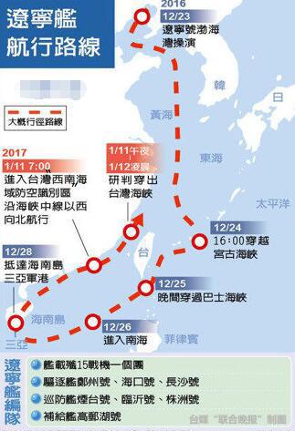 台灣軍方公佈的遼寧艦繞台線路