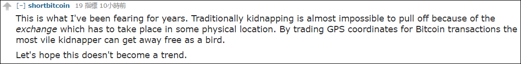 “這正是我所擔心的——傳統的綁架,綁匪難以完美脱身,就是因為收贖金總是需要具體的場所。而通過交易比特幣的地址(取得贖金),綁匪就能輕鬆逃出生天”