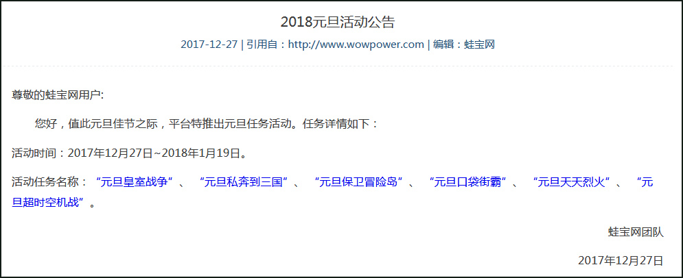 觀察者網發現,蛙寶網的微博已於7月停止更新。其網站已於12月27日推出元旦活動公告:
