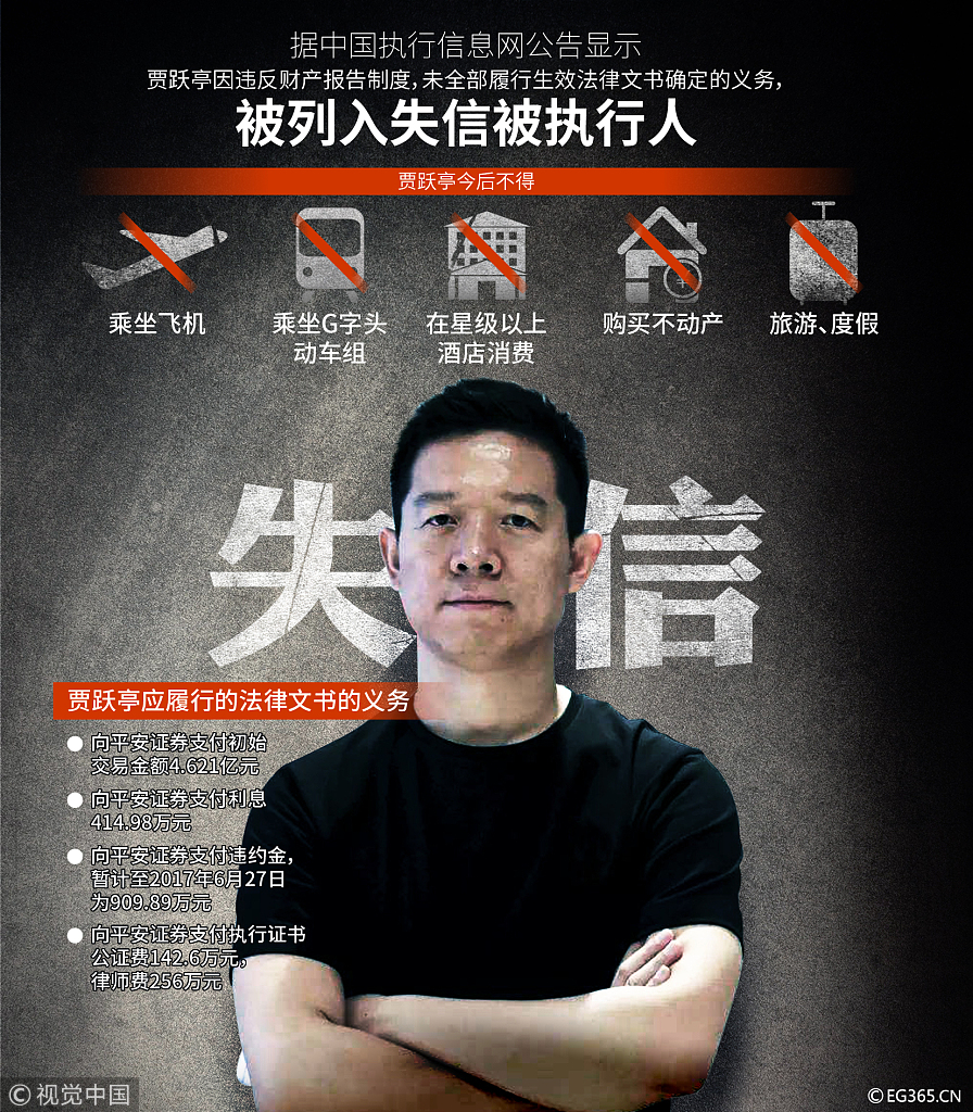 根據中國執行信息公開網信息顯示,賈躍亭因違反財產報告制度,已經兩次被列入失信被執行人名單。12月11日,因欠平安證券4.621億元未還,賈躍亭被法院第一次以自然人身份列為失信被執行人後,14日賈躍亭因與華福證券逾3億元的糾紛再次被列為失信被執行人。