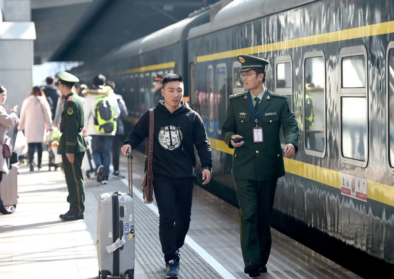 上午9時,在鐵路上海站,記者看到張偉名像往常一樣認真執勤,耐心疏導進站旅客,張偉名負責的進站口人流量大,每天都要不停的手持喊話器疏導進站旅客,今天上午大批客流返鄉後,上海站出行人流將減少,緊張的春運勤務也將得以緩解。負責上海站春運執勤的武警二支隊副支隊長王松青告訴記者,支隊黨委充分考慮戰士春節回家團圓的期盼,主動對參加春運執勤的官兵“開綠燈”,利用春運執勤空閒期,主動安排5名春運一線幹部士官返鄉過節。作為第七年的老兵,這次是張偉名第六次參加春運執勤,六年中因為春運執勤也未回家過上一個春節。今年9月份,與女友在上海訂婚後,一直沒有時間帶女友回家“認門”,本以為參加春運執勤不能回家,沒想到支隊“破例”安排他休假,待返程高峯時再歸隊。10時30分,張偉名在備勤室拿出行李箱,換上便裝,11點,值班幹部將張偉名送上了K2186/7次上海發往西寧的火車,雖然買不到高鐵票,只能乘“綠皮車”,好在晚上8點多就能到達徐州。