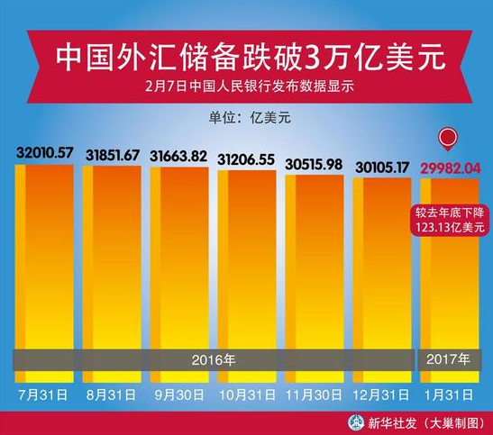 近日,央行公佈數據顯示,中國1月外匯儲備為29982億美元,環比下降123億美元,且連續7個月下滑,創2011年2月以來新低。也就是,2015年和2016年這短短兩年時間裏,中國外匯儲備縮水了近萬億美元。