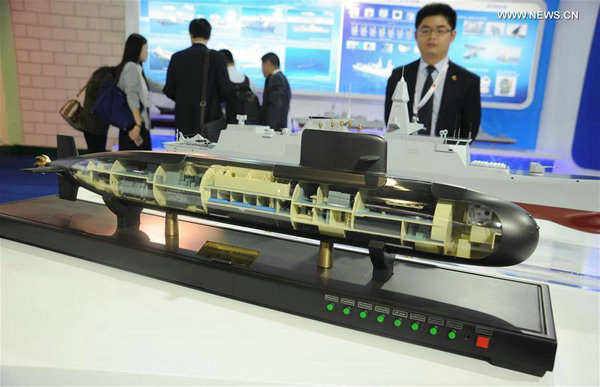 中國船舶重工國際貿易有限公司展出了麒麟級潛艇、4000噸級護衞艦、ET-52C魚雷等產品。其中,麒麟級潛艇是我國出口到巴基斯坦的新型常規潛艇,其出口合同金額創我國軍貿出口最高紀錄。有軍事觀察人士認為,麒麟級常規潛艇是039B型AIP潛艇的外銷版。