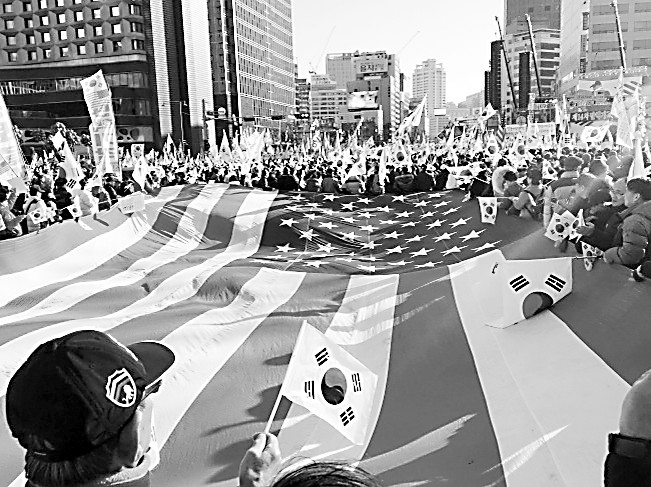 這一説法並不新鮮。在韓國,每逢“三一節”和光復節,大部分保守民眾同時揮舞太極旗和星條旗已成為慣例,只是,針對總統彈劾案這樣的純內政事務打出巨幅外國國旗,卻是頭一遭。
