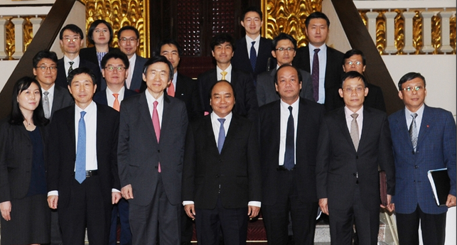 越南政府總理阮春福及政府官員同韓國外交部長尹炳世一行合影。陳海 攝 來自網絡