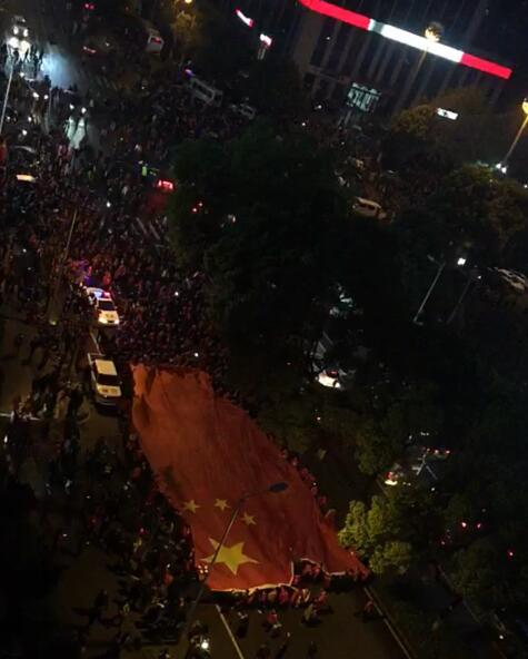 3月23日,中國足球隊在長沙賀龍體育場以1∶0擊敗了強大對手韓國隊,賽後很多國人鼓掌與興奮,還有愛國球迷高舉巨幅國旗上街慶賀。
