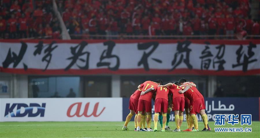 3月23日,中國隊球員在下半場開始前加油。當日,在長沙舉行的2018年俄羅斯世界盃預選賽亞洲區12強賽中,中國隊以1比0戰勝韓國隊。 新華社記者曹燦攝
