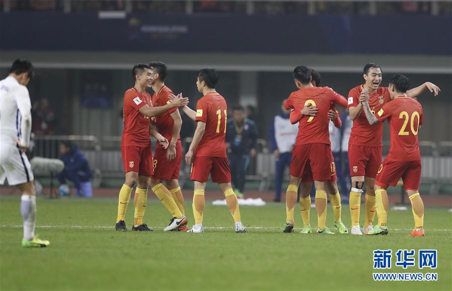 3月23日,中國隊球員慶祝勝利。當日,在長沙舉行的2018年俄羅斯世界盃預選賽亞洲區12強賽中,中國隊以1比0戰勝韓國隊。 新華社記者丁旭攝