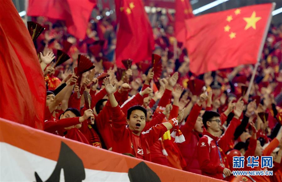 3月23日,球迷為中國隊加油助威。當日,在長沙舉行的2018年俄羅斯世界盃預選賽亞洲區12強賽中,中國隊以1比0戰勝韓國隊。 新華社記者王毓國攝