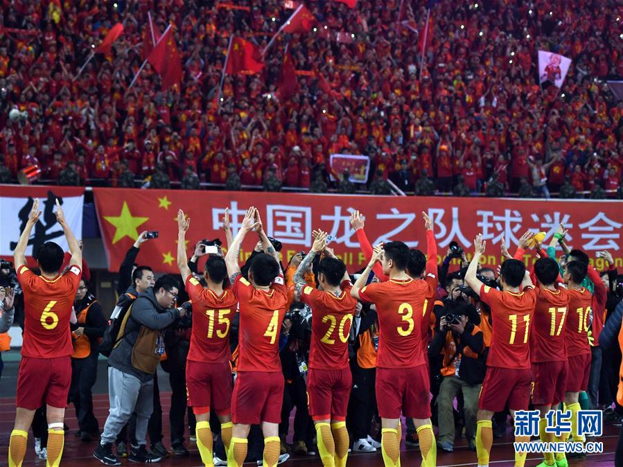 3月23日,中國隊球員在比賽後向球迷致意。當日,在長沙舉行的2018年俄羅斯世界盃預選賽亞洲區12強賽中,中國隊以1比0戰勝韓國隊。 新華社記者曹燦攝
