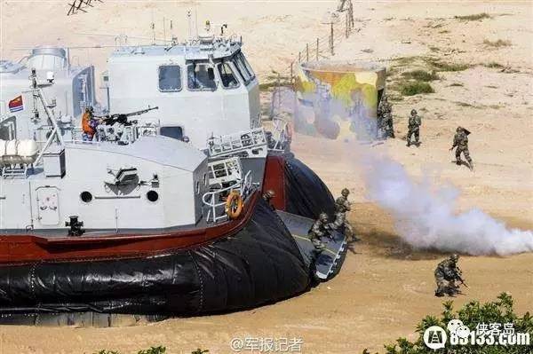 比如,拿726氣墊登陸艇來説,它能夠以60節的速度高速衝灘(一般兩棲車輛的水上速度是6、7節),僅衝灘速度就縮減8倍以上,整個登陸艦編隊全部登陸所需的時間,也縮減為原先的幾分之一;發動登陸作戰時,傳統的換乘環節可以先期在塢艙內完成,中國海軍陸戰隊在面對敵方灘頭火力的時間不僅大為縮減,必然會減少傷亡。