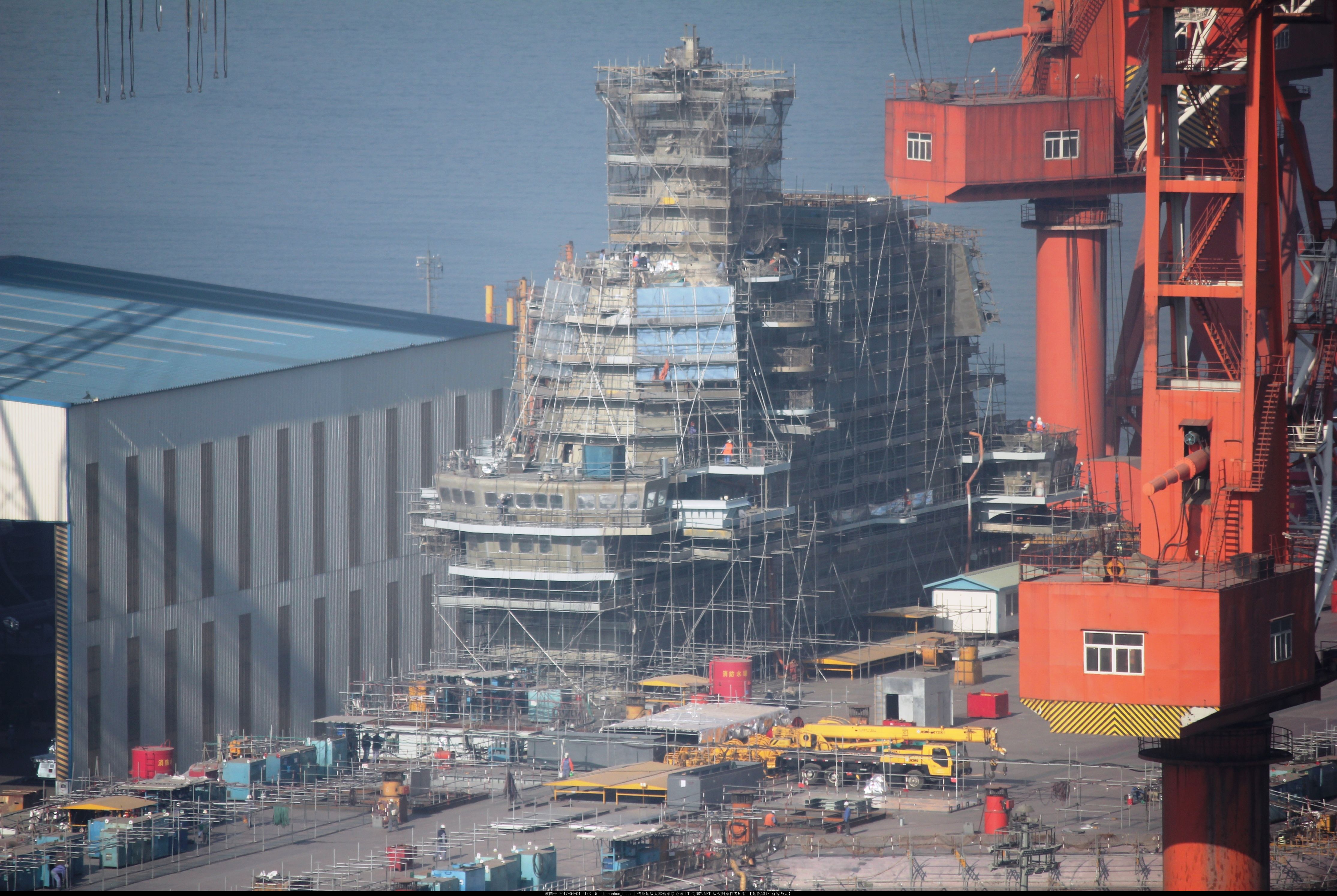 媒體報道稱,從3月以來網絡上的照片顯示首艘國產航母已塗裝紅色底漆,艦島上已開始安裝玻璃及相控陣雷達等設備。最近曝光的照片更顯示已開始清理甲板,可能於近期下水。