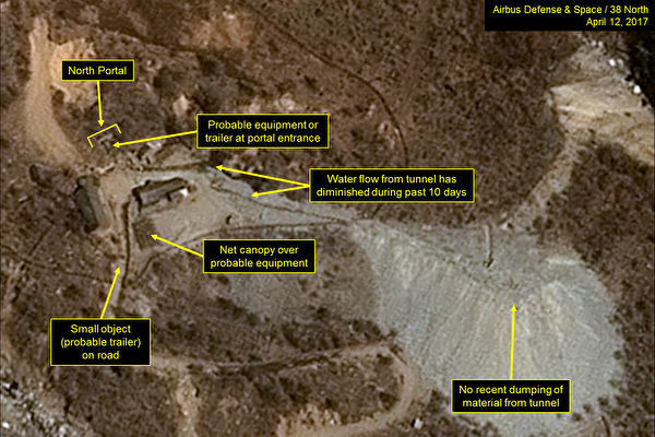 4月13日,美國專門對朝網站“38 North”表示,對拍攝的豐溪里核試驗場衞星照片分析後發現朝鮮核試驗場已經“準備就緒”。
